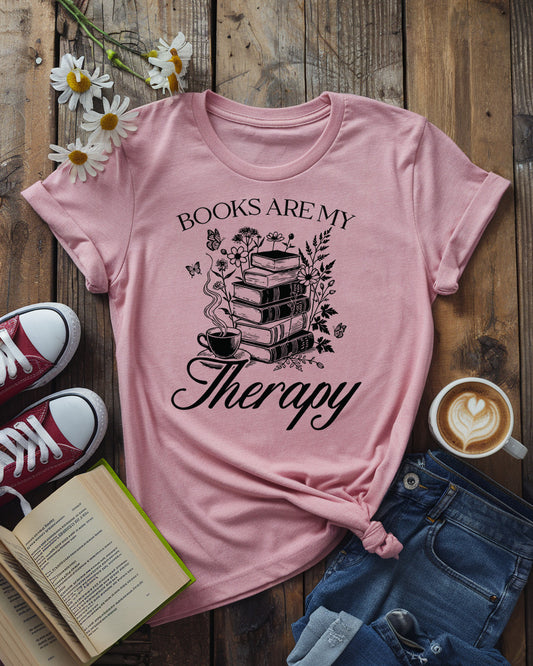 Books Are My Therapy Tee, Floral Book Stack Cozy Reading