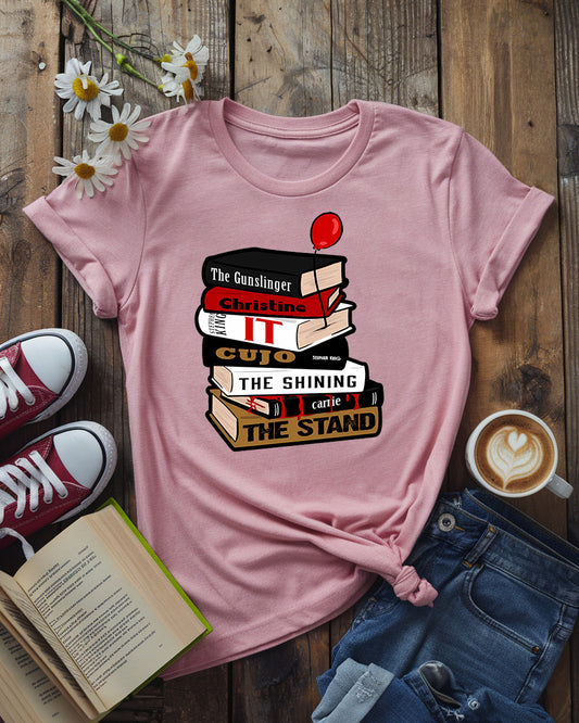 Stephen King Book Stack Tee, Iconic Horror Novels
